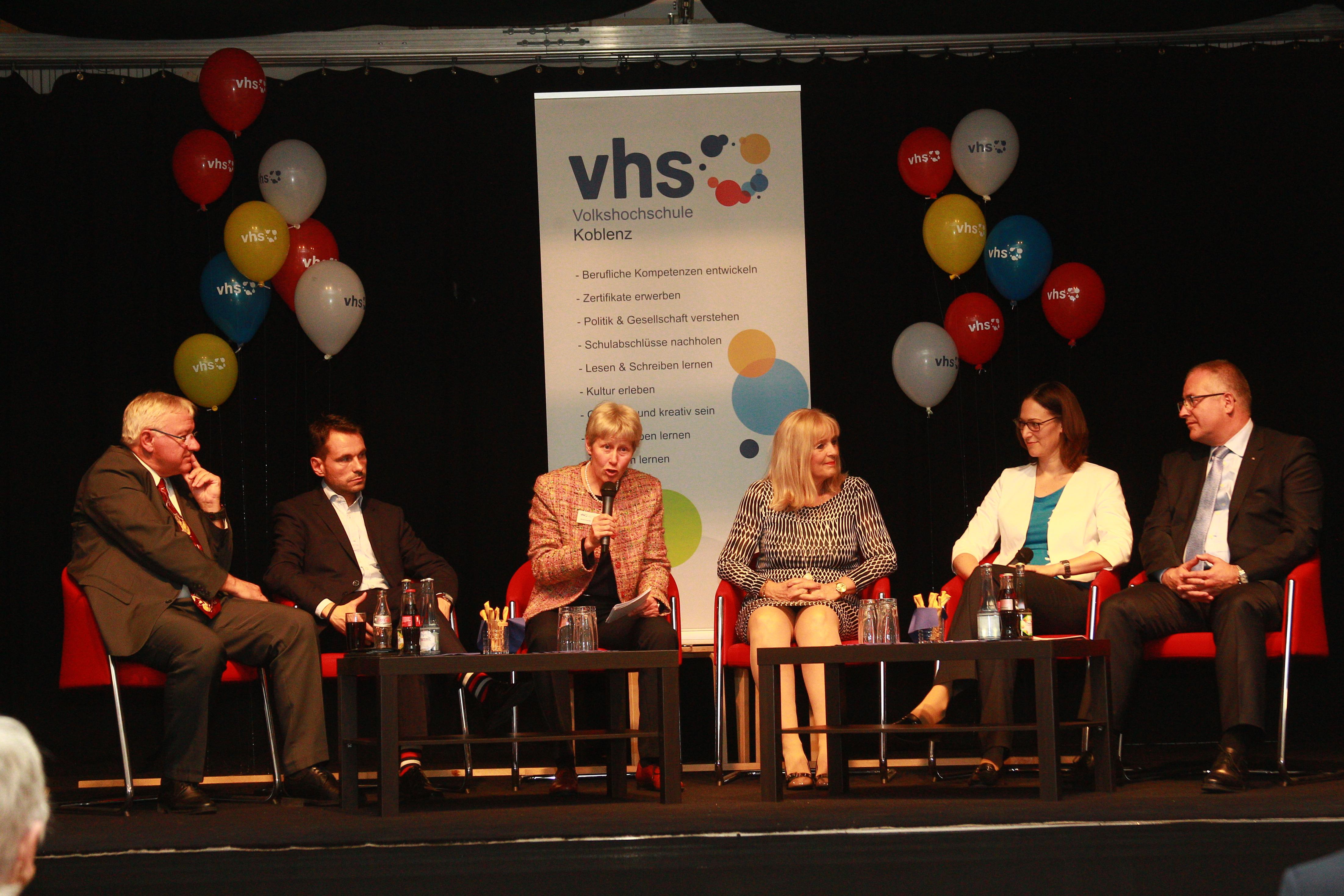 Begrüßungstalk zum Lebenslangen Lernen mit Prof. Dr. Joachim Hofmann-Göttig (Oberbürgermeister der Stadt Koblenz), David Langner (Staatssekretär im Ministerium für Soziales, Arbeit, Gesundheit und Demografie des Landes Rheinland-Pfalz), Priv. - Doz. Dr. Margit Theis-Scholz (Kulturdezernentin der Stadt Koblenz), Steffi Rohling (Verbandsdirektorin Landesverband der Volkshochschulen in Rheinland-Pfalz e.V.), Jörg Perscheid (Vorsitzender der Freunde der Volkshochschule der Stadt Koblenz e.V.). Die Fragen stellte Nicole Kuprian (Leiterin der Volkshochschule Koblenz).